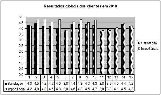 Na figura abaixo apresentam-se os resultados do grau de satisfação que os respondentes sentem quanto ao desempenho da empresa (fundo preto) relativamente aos indicadores avaliados. Com fundo branco, representa-se também a importância que atribuem a cada um dos indicadores avaliados.